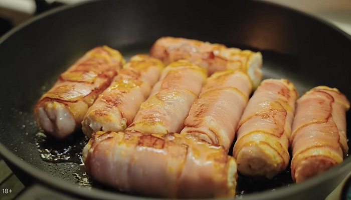 Вкусные, ароматные колбаски с беконом и сыром по-Ивлевски готовы! Приятного аппетита!