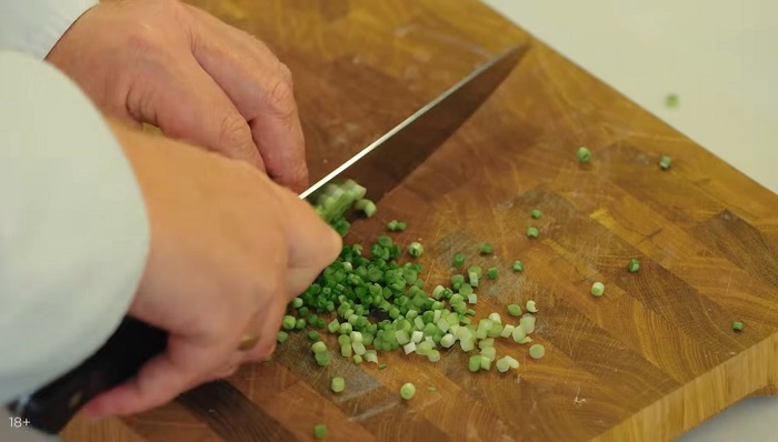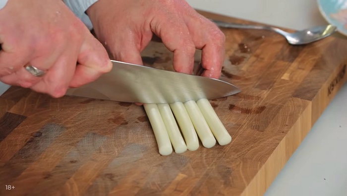Мелко нарезаем зеленый лук, украшаем колбаски. -