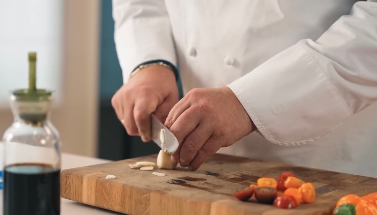 Первым делом нарежем все овощи: помидорки на 2 части, чеснок тонкими слайсами, перец, зелёный лук и салат. -