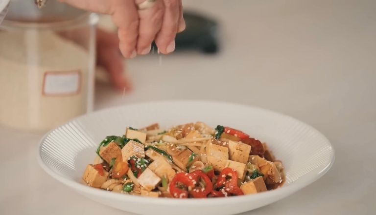 Выкладываем в тарелку, сверху посыпаем кунжутом и вкуснейший удон с овощами и копчёным тофу по-Ивлевски готов! Ай да к столу!