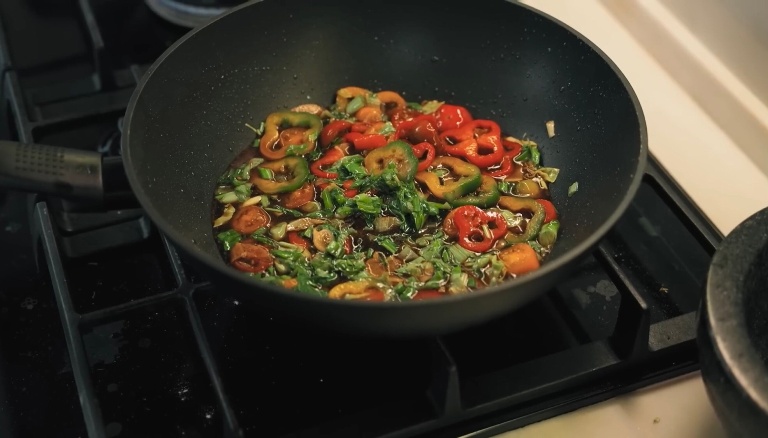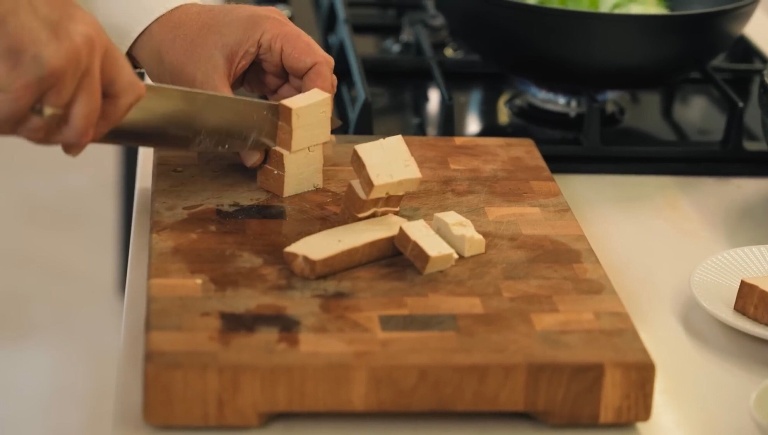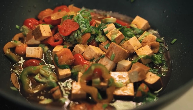 Нарезаем копчёный тофу крупными кубиками, к овощам вольём небольшое количество воды, добавим соевого и устричного соуса и закинем туда же тофу. -