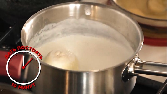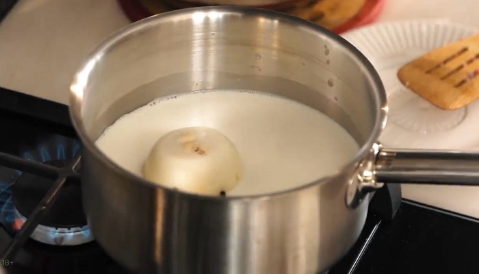 В луковицу втыкаем гвоздику, закладываем ее в сотейник с молоком, доводим до кипения, а затем даем постоять 10 минут. -
