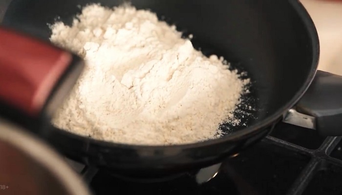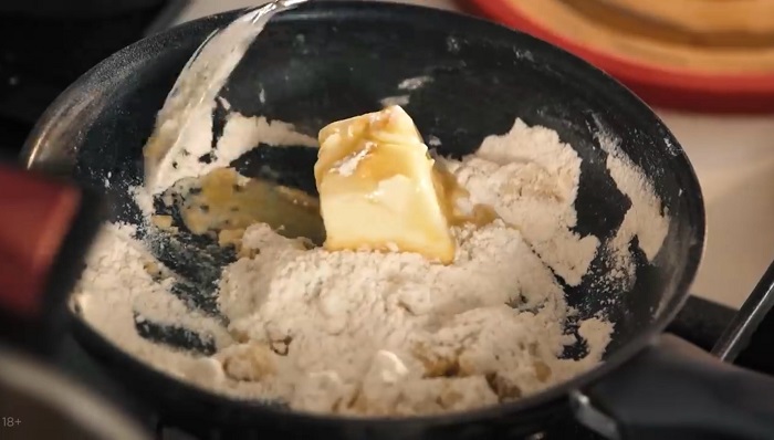 Муку прижариваем на сухой сковороде до слегка кремового цвета, а затем закидываем к ней кусок сливочного масла и хорошо мешаем. -
