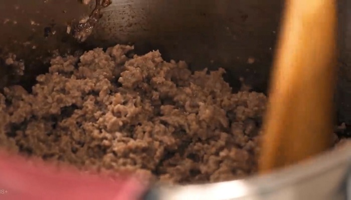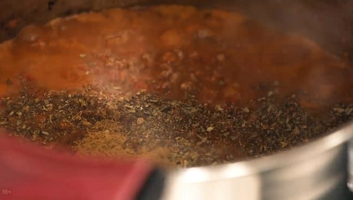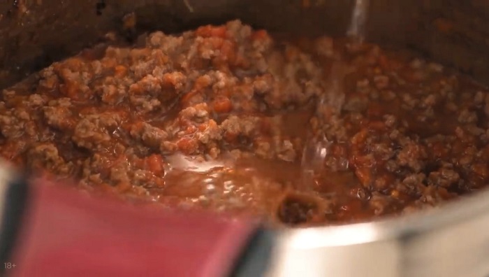 Фарш обжариваем на оливковом масле, затем вводим в него томаты, добавляем немного воды и специй, мешаем и выпариваем. -