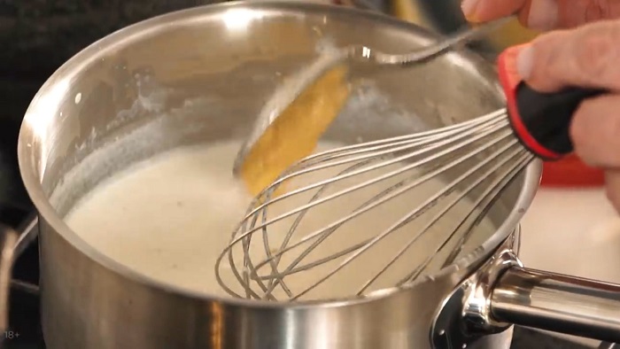 Добавляем в молоко соли и немного гранулированного чеснока, луковицу достаем, снова ставим на огонь, вводи мучную пассировку и, доводя до кипения, постоянно помешиваем (соус должен загустеть). -