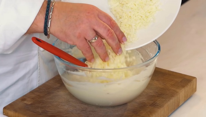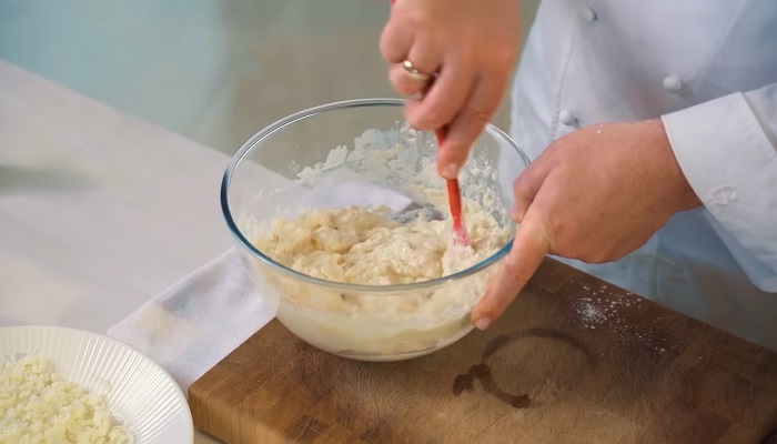 Добавляем сыр сулугуни и еще раз замешиваем. -