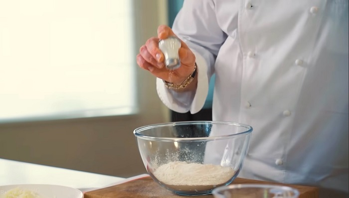 В большую миску высыпаем муку, добавляем разрыхлитель, соль, мешаем. -