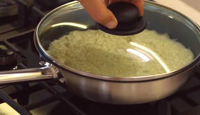 В сковороду вливаем немного растительного масла, выкладываем тесто, разравниваем, сковороду накрываем крышкой, прижариваем на умеренном огне с двух сторон примерно 4 минуты. -
