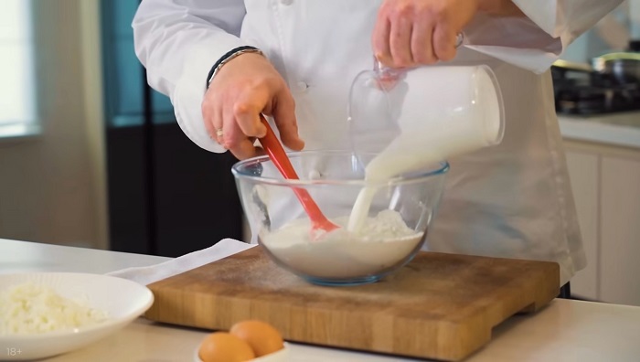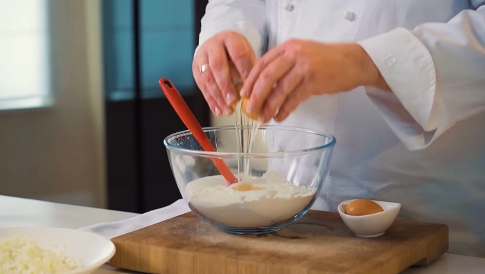 Вливаем кефир, разбиваем два яйца, замешиваем тесто. -