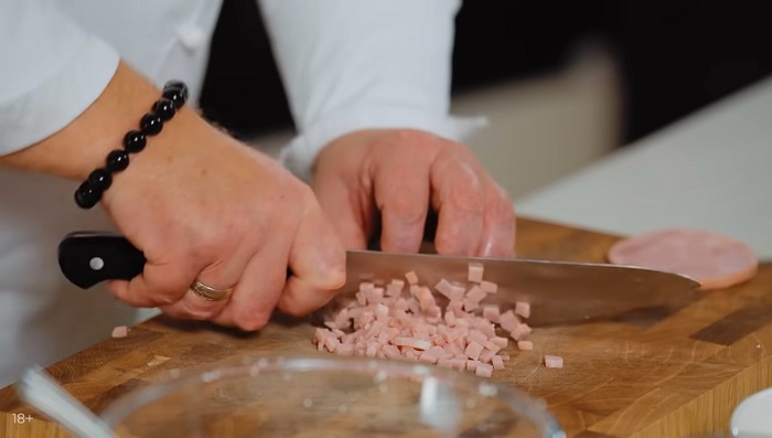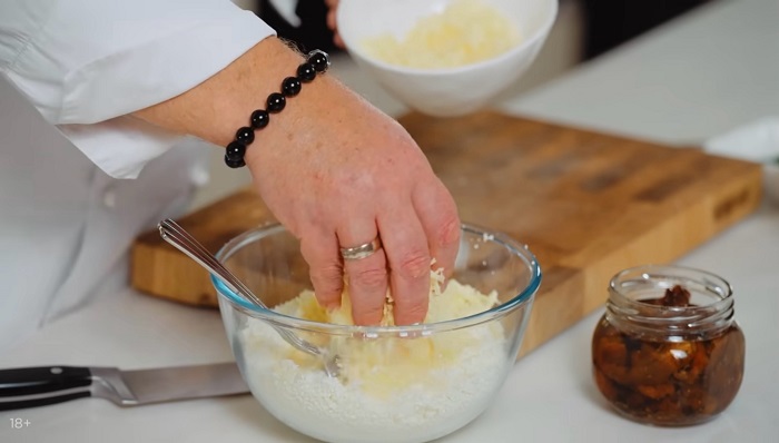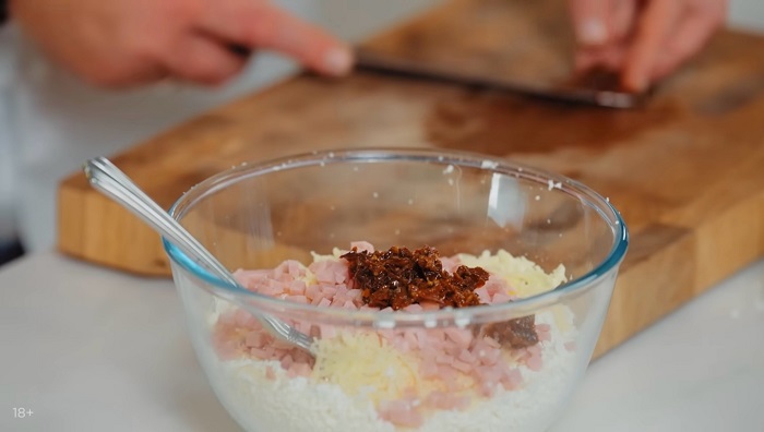 Нарезаем ветчину и вяленые томаты мелким кубиком, закидываем туда же и замешиваем "тесто". -
