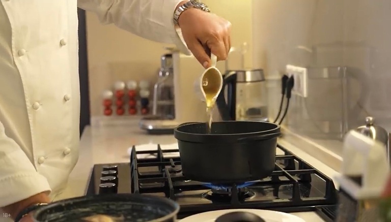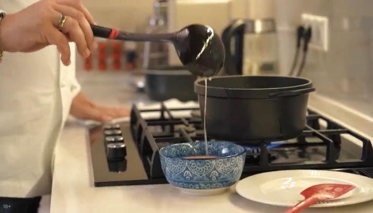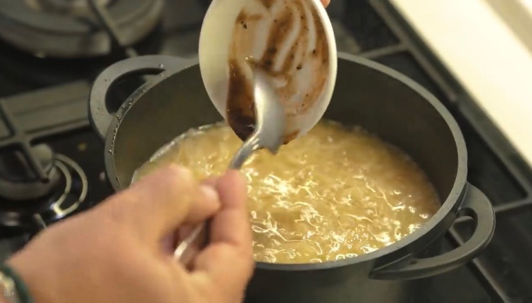 С супа нужно снять масло и приправить соусом демиглас, солью, добавить куриный кубик и мускатный орех. -