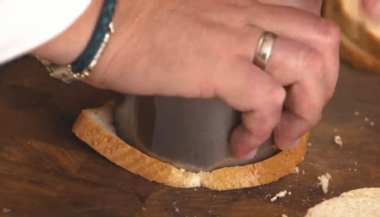Перельём суп в горшочки для запекания, с помощью формы для салата вырежем из тостового хлеба кружочки, отправим его подсушиться в духовку на пару минут при температуре 240 градусов. Выкладываем хлеб на суп, сверху добавим тёртого пармезана. -