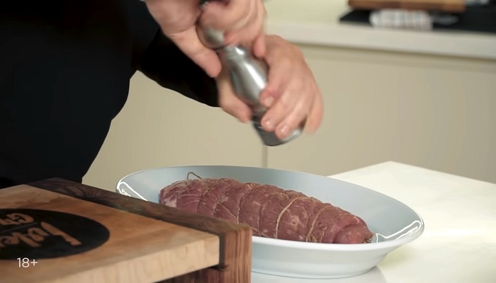 Обворачиваем рулет ниткой "бичевкой" как показано на фото, сверху еще раз соли, перчим, поливаем небольшим количеством растительного масла. -