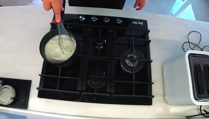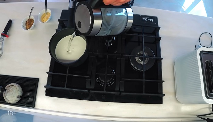 Теперь приготовим сливочно-горчичный соус. В сотейник вливаем сливки и немного кипятка, ставим на огонь, добавляем оба вида горчицы, соли, перца и сахара, мешаем венчиком. -
