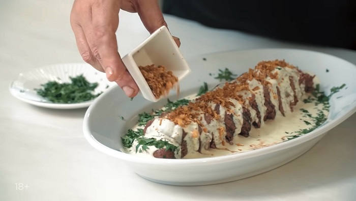 Снимаем веревку, нарезаем рулет, подаем вместе с соусом, украшаем мелко нарезанной свежей петрушкой и хрустящим гранилированным луком! Готово! Приятного аппетита!