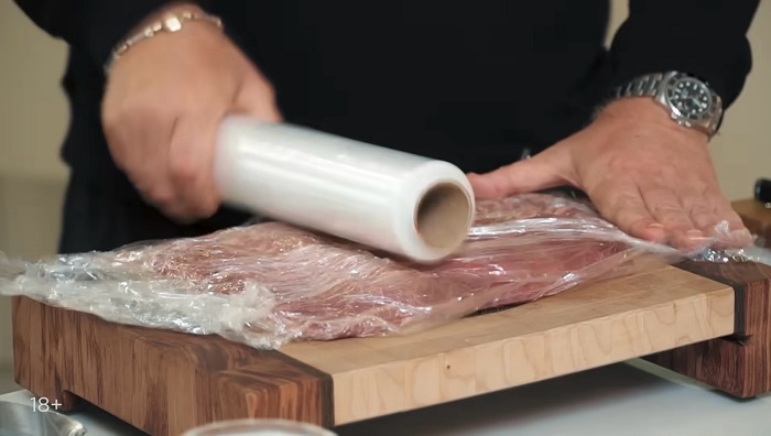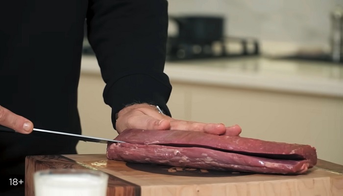 Вырезку разрезаем вдоль, раскрываем, оборачиваем пищевой пленкой и слегка отбиваем. -