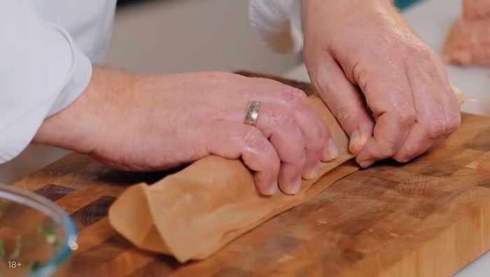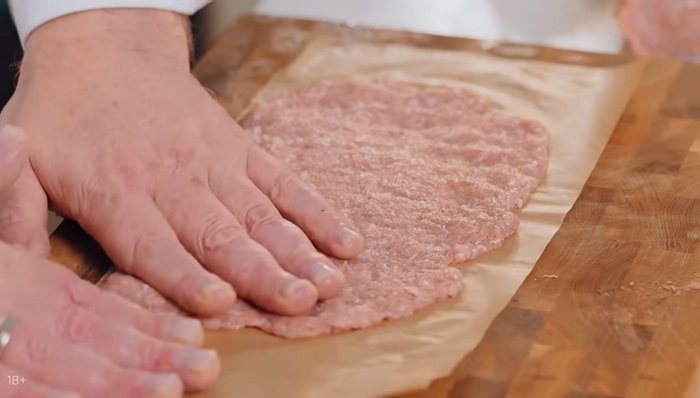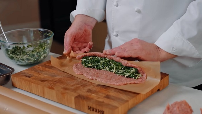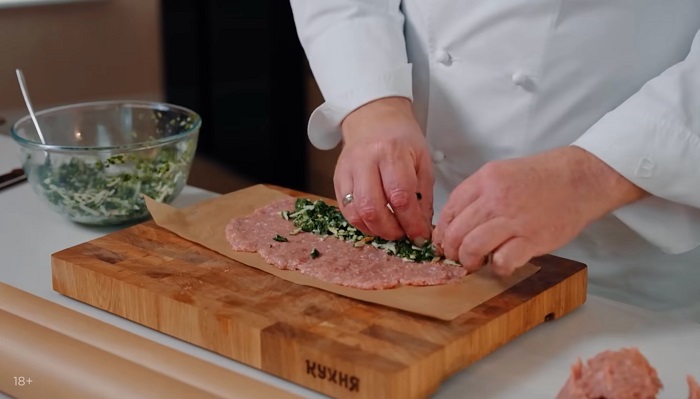 Начинаем формировать люля. На пергамент выкладываем фарш тонким слоем, выкладываем начинку из шпината и сыра и с помощью пергамента закручиваем его в колбаску. -