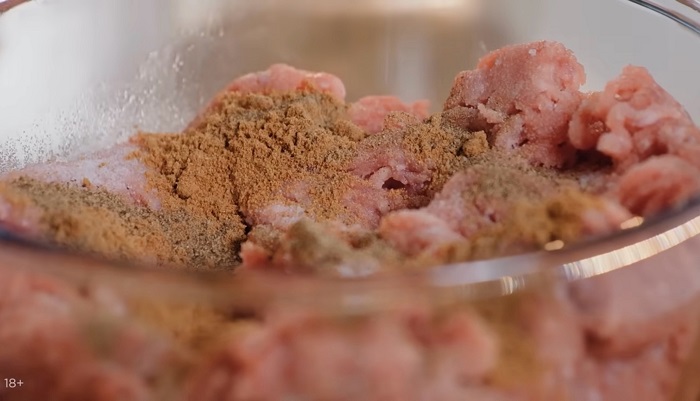 Фарш солим, перчим, добавляем молотый кориандр, мешаем. -