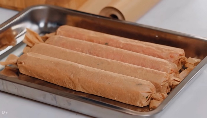 Проделываем те же действия с остальным фаршем. Колбаски выкладываем в лоток для запекания и отправляем постоять в холодильник. -