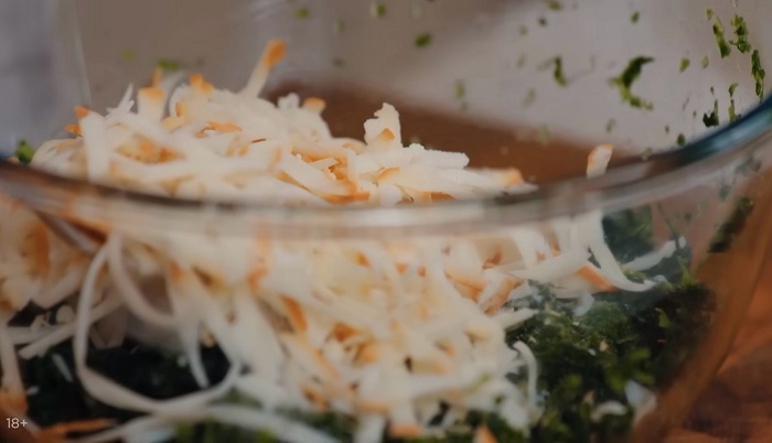 Свежемороженный рубленный шпинат замешиваем с копчёным сулугуни, добавляем чеснока и соли. -