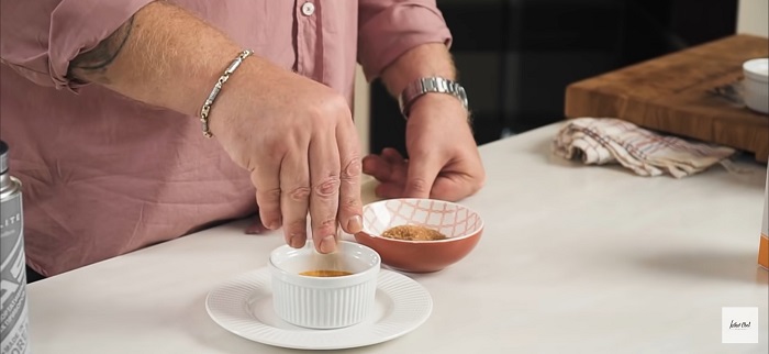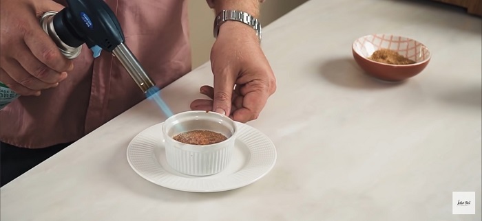Сначала даём десерту немного охладиться в холодильнике, затем в каждую формочку засыпаем немного тростникового сахара поверх и обдаём его газовой горелкой (для того чтобы на крем-брюле появилась карамелизированная корочка). Вкуснейший десерт от шефа готов! Приятного аппетита!