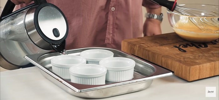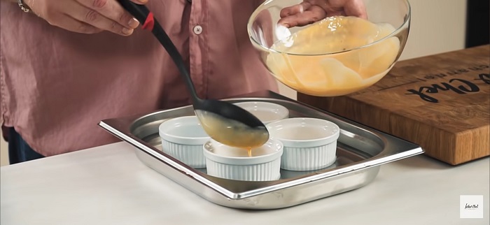 Приготовим лоток с формочками для крем-брюле, в лоток вливаем небольшое количество воды и начинаем разливать массу по формочкам. Отправляем в духовку на 45 минут при 110 градусах. -