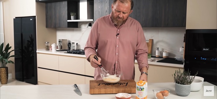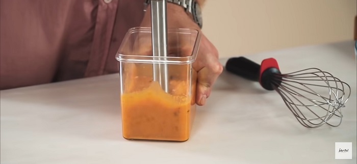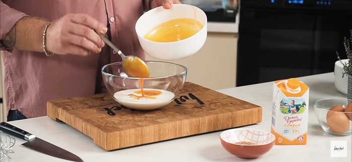 К яичным желткам вливаем сливки, добавляем облепиховый соус и хорошо замешиваем всё венчиком до однородной массы. -