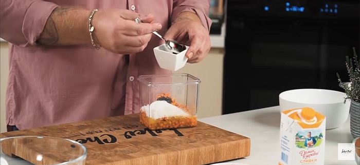 Облепиху перекладываем в форму, добавляем сахарный песок и ванильный сироп. Пробиваем до однородной массы блендером. -