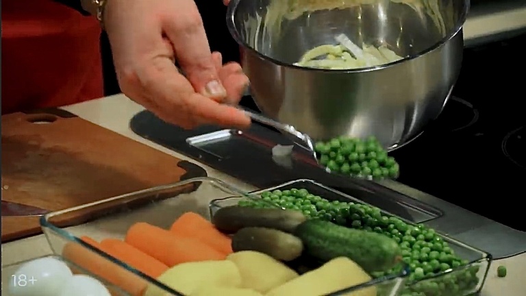 Добавляем зеленый горошек, нарезаем кубиком свежий и соленый огурец. -