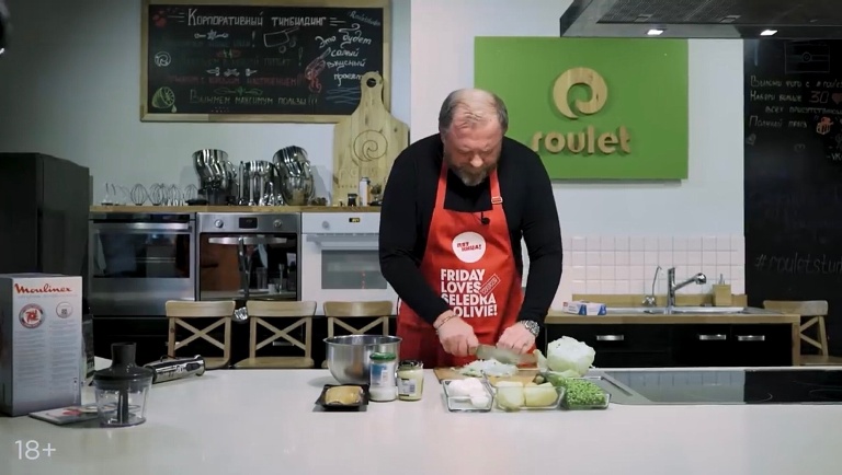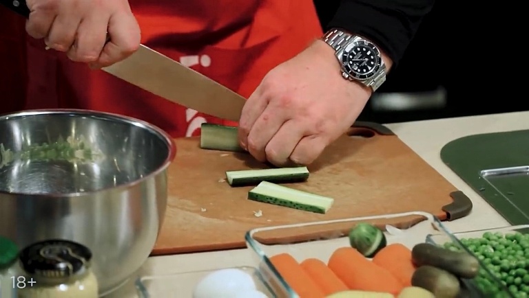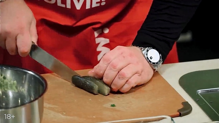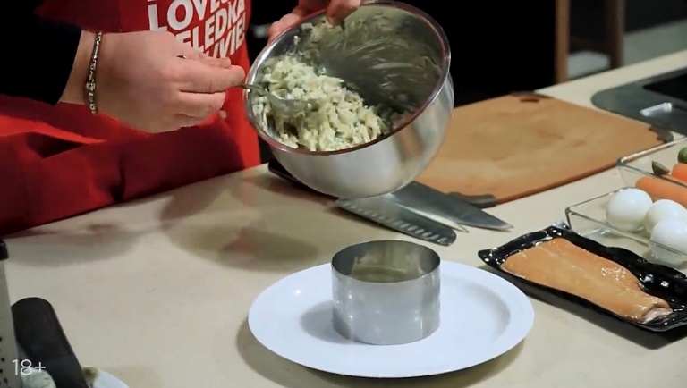 С помощью металлического кольца выкладываем салат на тарелку, сверху украшаем перепелиной грудкой. Вот и всё, наш салат "Оливье" по-Ивлевски готов!