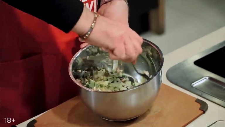 Пожаренное филе перепелки также мелко нарезаем, добавляем к салату. -