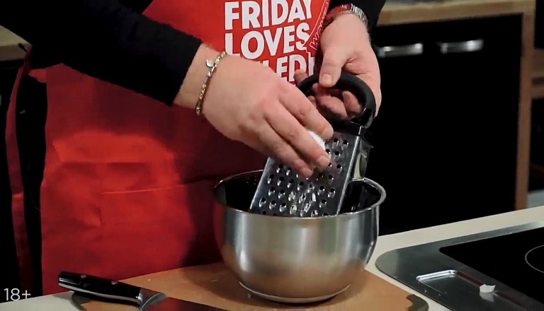 На терке натираем варёное яйцо, добавляем его к салату. -
