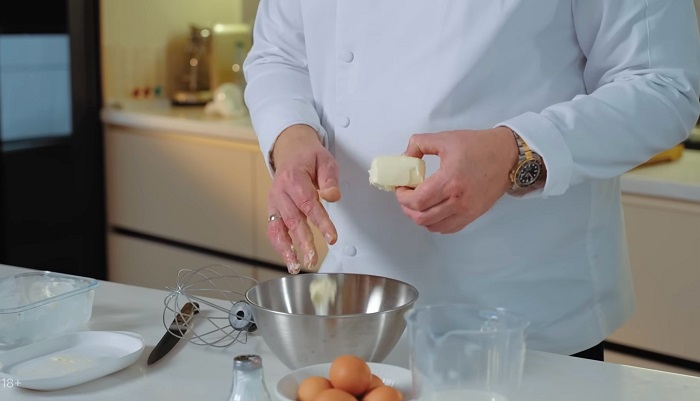 Берем немного сливочного масла, к нему разбиваем 5 яиц, хорошо взбиваем все венчиком. -