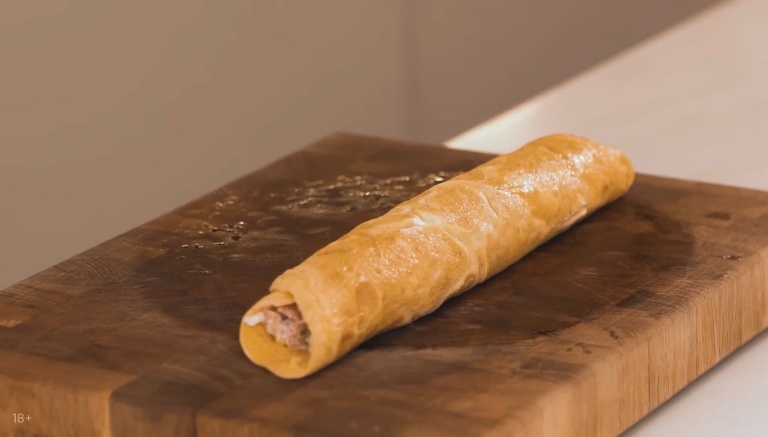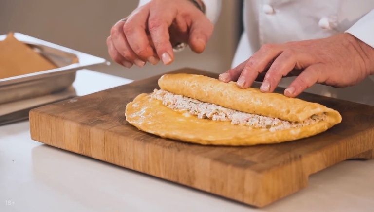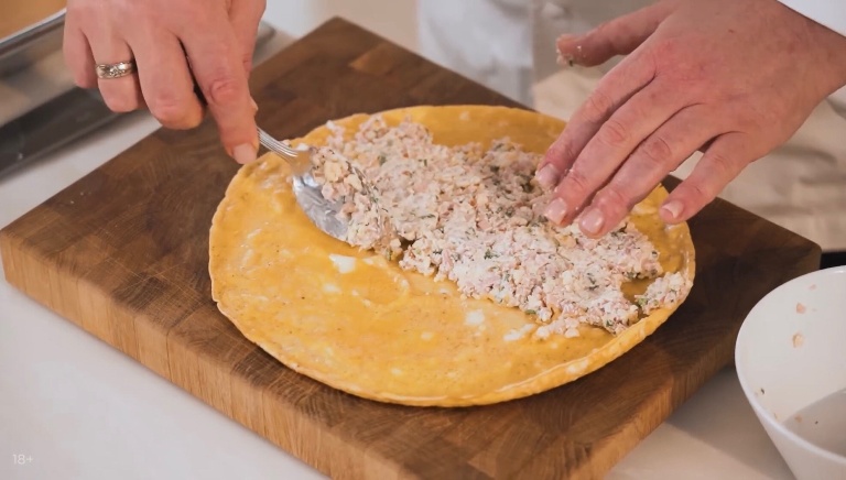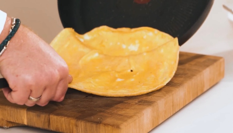 Перекладываем омлет на доску, сверху на одну половину омлета выкладываем начинку из ветчины и сыра и заворачиваем как блинчик. -