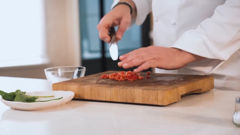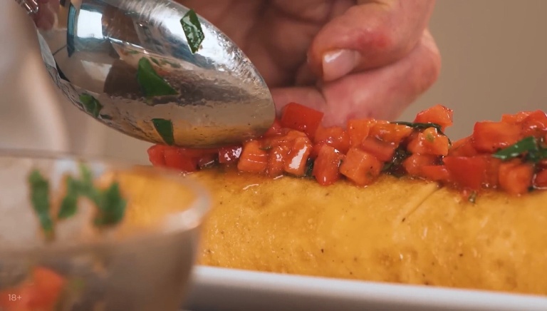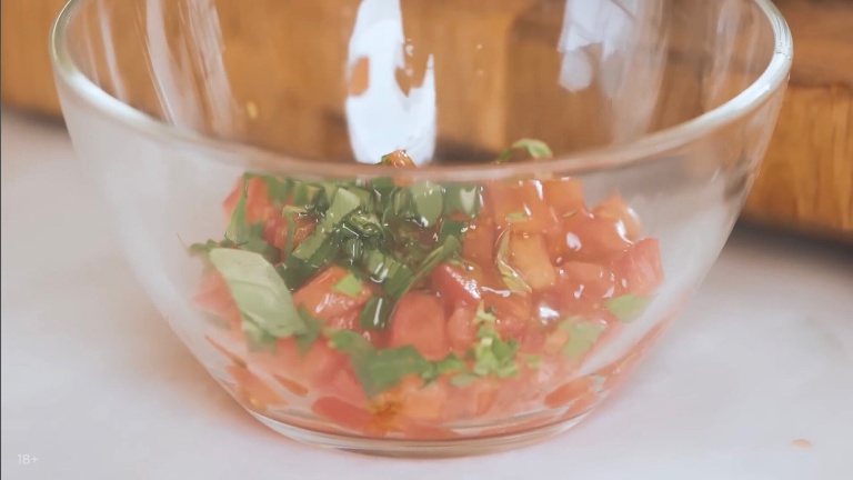 Помидоры нарезаем мелким кубиком, к ним закинем ещё зелёного базилика, польём оливковым маслом, посолим и поперчим. -