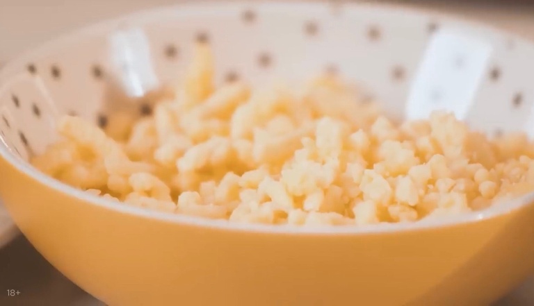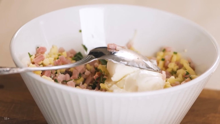 В первую очередь сыр нужно натереть, а ветчину нарезать очень мелким и тонким кубиком и смешаем их. -