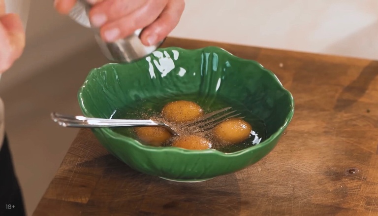 Вбиваем 4 яйца в миску, добавляем соли, перца и взбиваем. -