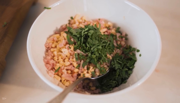 Лук сибулет и зелёный базилик также нарезать мелко. Закидываем к ветчине и сыру и добавим ещё мягкого сыра (творожный или плавленный) и всё перемешаем. -