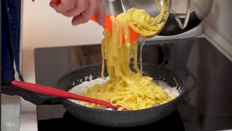 Отварную пасту добавляем к готовому сливочному соусу, тщательно перемешиваем. -