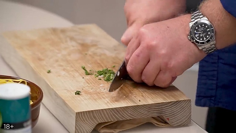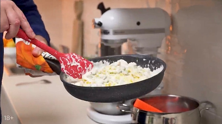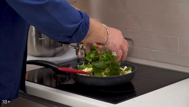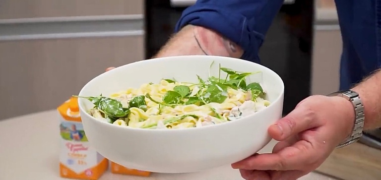 Добавляем свежий шпинат и еще раз перемешиваем. Наша паста с курицей в сливочном соусе от Константина Ивлева готова, приятного аппетита!