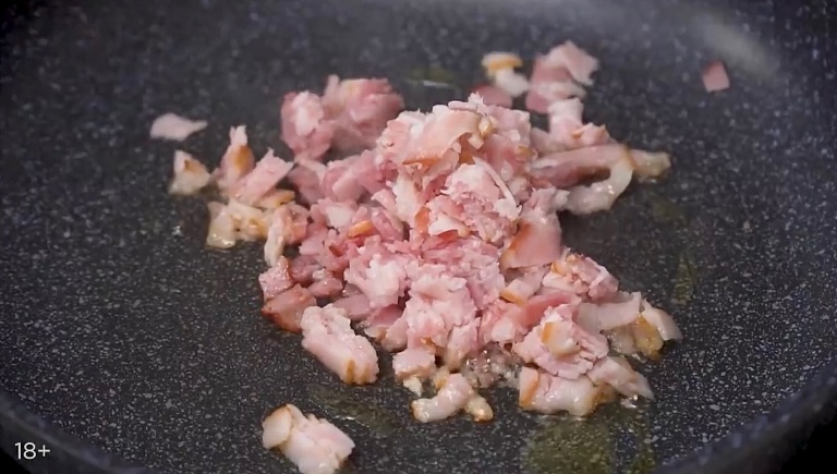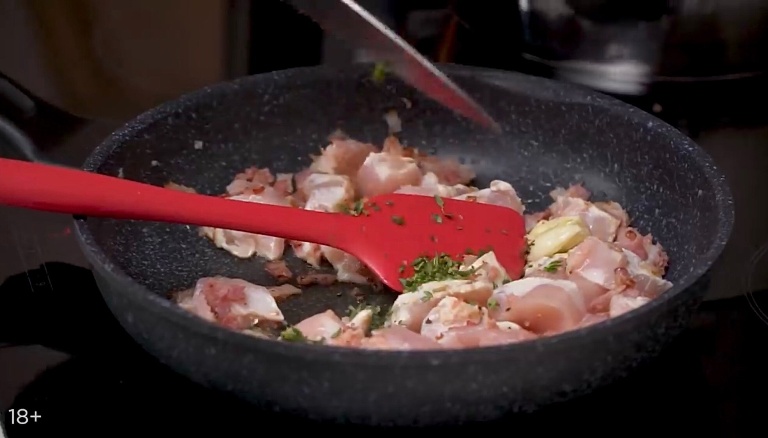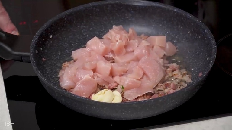 Куриную грудку также нарезаем кубиками, нарезаем чеснок и выкладываем всё это к бекону, продолжаем прижаривать, чуть убавив огонь -
