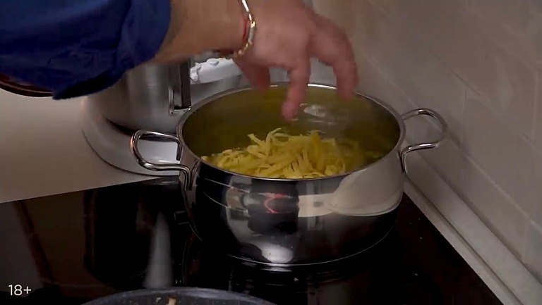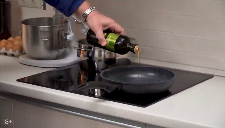 Ставим воду на огонь, когда вода закипает, добавляем небольшое количество соли, оливкового масла и его же на разогретую сковроду. -