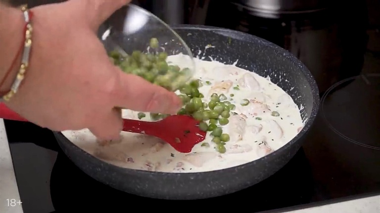 Вливаем сливки к обжаренному мясу, туда же горошек, солим, перчим, перемешиваем. -