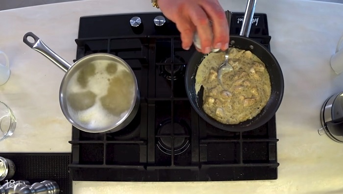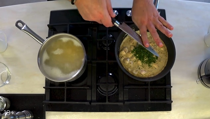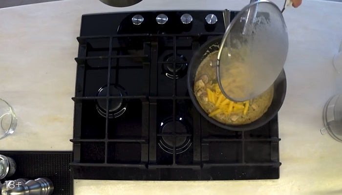 Пасту сливаем, отправляем в соус, перемешиваем. Пенне с грибами и курицей от шефа Ивлева готова!