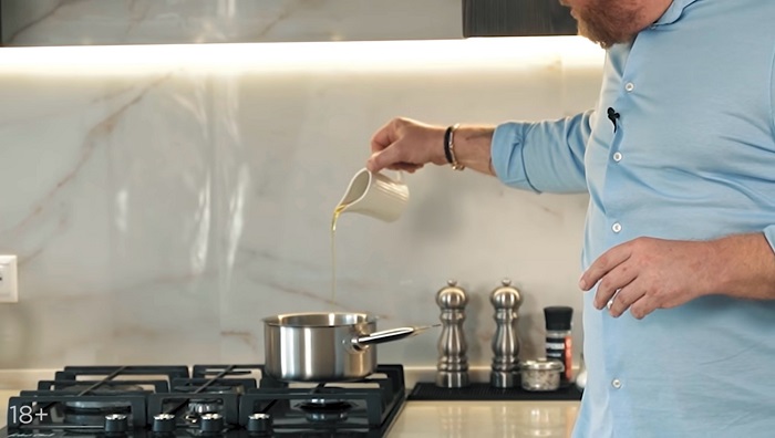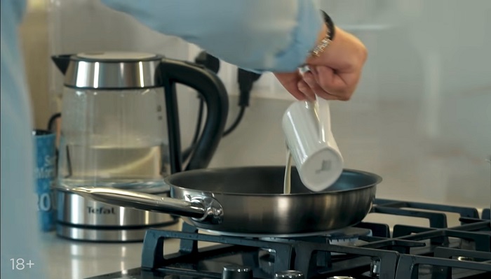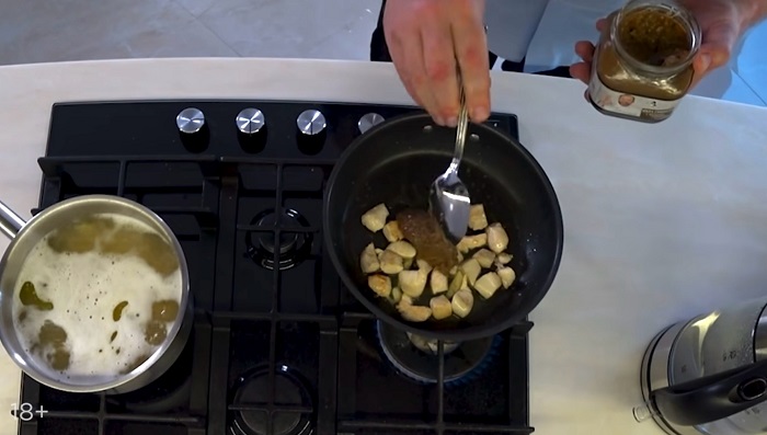В сковороду вливаем оливковое масло, закидываем раздавленный чеснок и прогреваем его в течение 30-40 секунд, а затем добавляем куриное филе, прижариваем. -