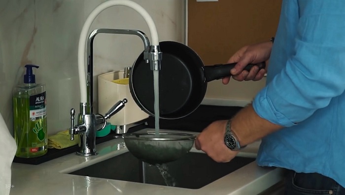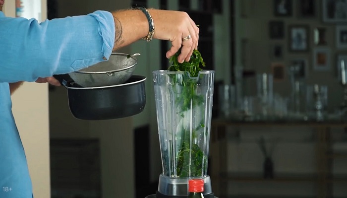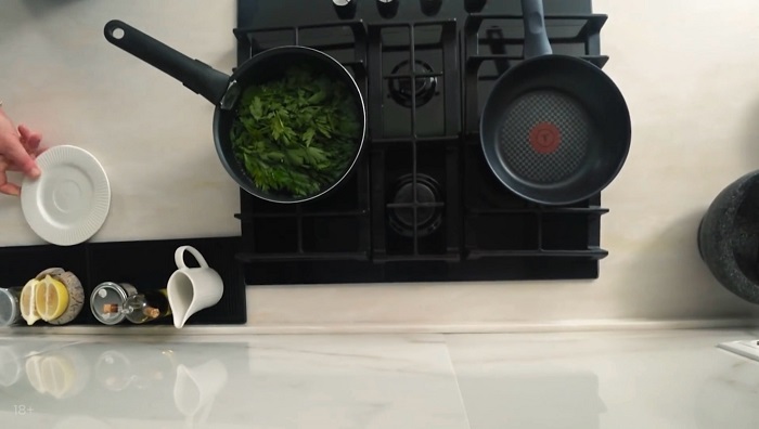 В кипящую воду укладываем петрушку, держим 1 минуту, а затем откидываем под холодную воду. -