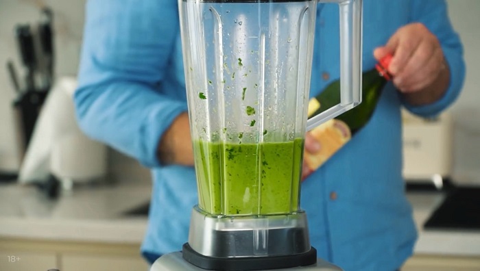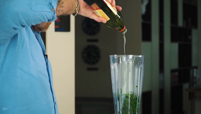 Закладываем петрушку в блендер, добавляем соли, зубчик чеснока и оливковое мало, пробиваем. У нас получилось зеленое чесночное масло. -