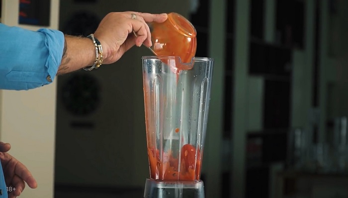 В блендер закладываем очищенные помидоры, зубчик чеснока, сладкий перец (предварительно запеченный без кожицы), перец, соль и немного оливкового масла. Пробиваем до однородности. -