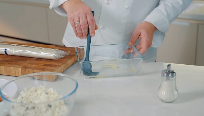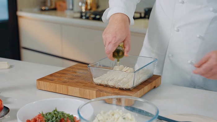Форму для запекания смазываем оливковым маслом, фило тесто подрезаем до нужного размера, складываем "гормошками" и выкладываем их в форму, сверху еще немного масла. -