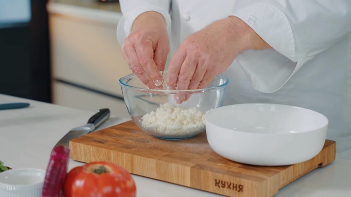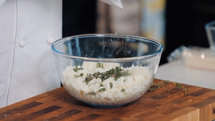 В глубокую миску руками крошим фетаксу, добавляем немного тимьяна, мешаем. -